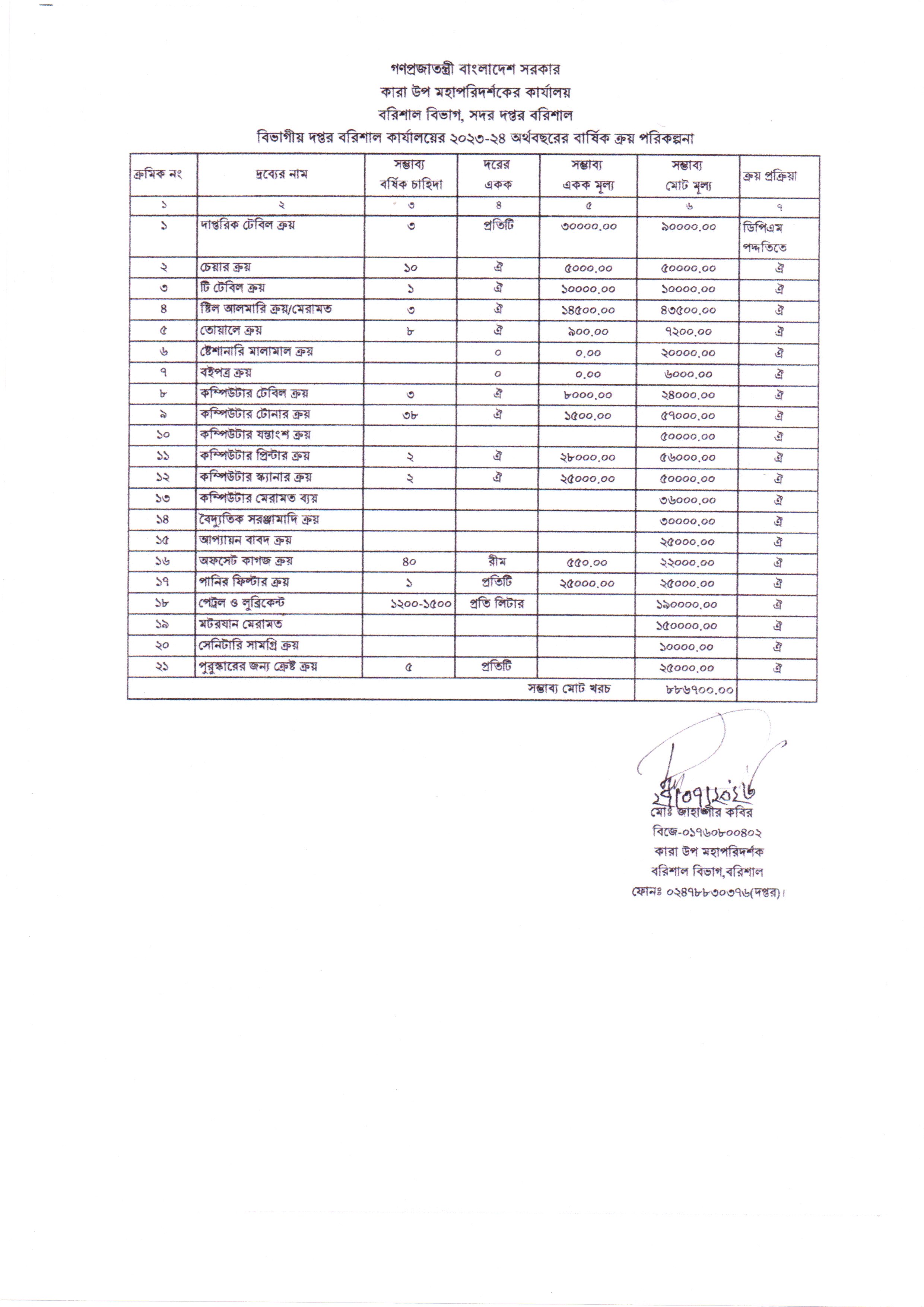 | ২ | বিভাগীয় দপ্তর, বরিশাল কার্যালয়ের ২০২৪-২০২৫ অর্থবছরের ক্রয় পরিকল্পনা। | |